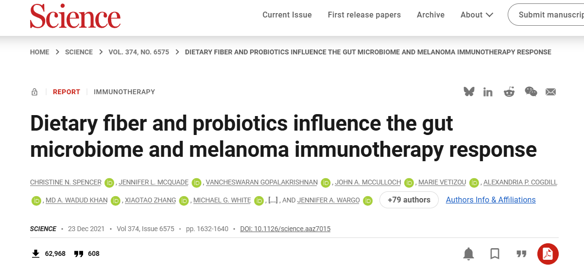 提到癌症治疗,人们通常会想到手术、化疗、放疗,或是近年来备受关注的免疫治疗。但你可能不知道,餐桌上常见的膳食纤维,或许能成为免疫治疗的 “神助攻”;而不少人日常补充的益生菌,却可能悄悄削弱治疗效果。2021 年发表在国际顶级期刊《Science》上的一项重磅研究Dietary fiber and probiotics influence the gut microbiome and melanoma immunotherapy response,为我们揭开了饮食、肠道菌群与癌症免疫治疗之间的神秘面纱。