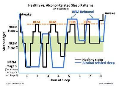 每个睡眠阶段都是必不可少的,现在研究普遍认为深度睡眠和REM睡眠是身体和精神恢复最重要的阶段。而睡前饮酒会增加前2个周期对REM睡眠的抑制,由于酒精的镇静作用,饮酒者的入睡时间通常较短,有些人很快就会进入深度睡眠。但随着时间推进,会在NREM和REM睡眠之间产生不平衡,这会降低整体睡眠质量,从而导致睡眠整体时间缩短,睡眠中断。这也是为什么很多人在喝酒后,就算睡很久,第二天还是感到疲劳和嗜睡; 且喝的酒越多,对睡眠的负面影响越大。