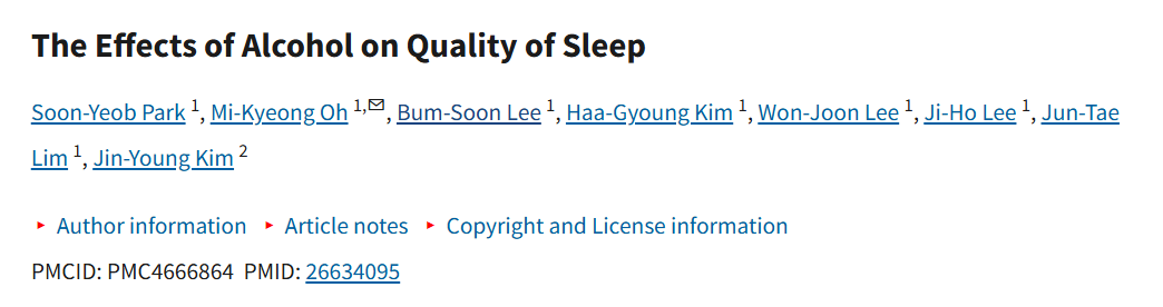 【1】Park SY, Oh MK, Lee BS, et al. The Effects of Alcohol on Quality of Sleep. Korean J Fam Med. 2015;36(6):294-299. doi:10.4082/kjfm.2015.36.6.294