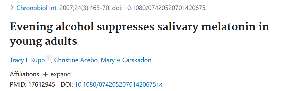 【2】Rupp TL, Acebo C, Carskadon MA. Evening alcohol suppresses salivary melatonin in young adults. Chronobiol Int. 2007;24(3):463-470. doi:10.1080/07420520701420675
