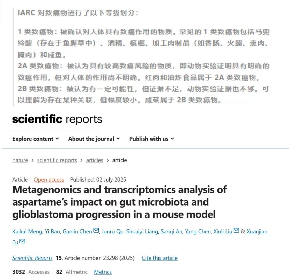 1. Meng, K., Bao, Y., Chen, G. et al. Metagenomics and transcriptomics analysis of aspartame’s impact on gut microbiota and glioblastoma progression in a mouse model. Sci Rep 15, 23298 (2025). https://doi.org/10.1038/s41598-025-06193-5
