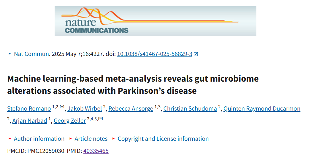 参考文献:Romano S, Wirbel J, Ansorge R, et al. Machine learning-based meta-analysis reveals gut microbiome alterations associated with Parkinson's disease. Nat Commun. 2025;16(1):4227. Published 2025 May 7. doi:10.1038/s41467-025-56829-3